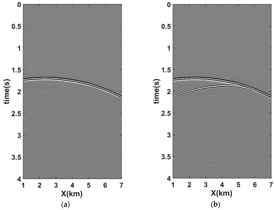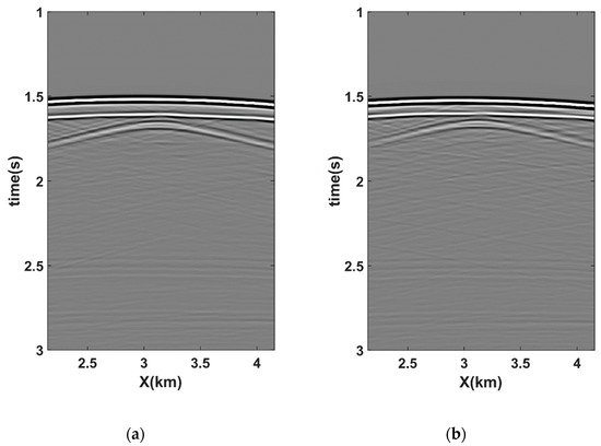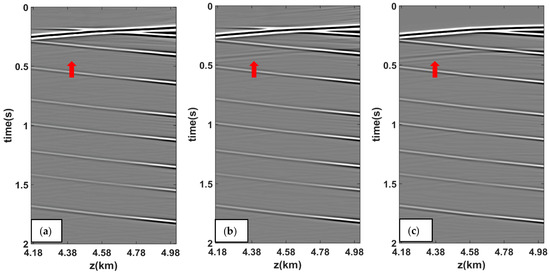 It can be clearly noticed from Figure 4 that the Green’s function obtained by the standard Marchenko receiver redatuming method lacks the lateral propagating wave components from diffractions compared to the actual measured VSP signal. Then, we also iteratively compute the focus function by the standard Marchenko method, where (X: 3500 m; Z: 4170–5020 m) is an array of virtual receivers along the left vertical white line in Figure 1. We substitute and , respectively, into Equation (16) to estimate the source-receiver redatumed Green’s functions between the virtual source and virtual receivers . The results of the standard Marchenko source-receiver redatuming method and the Marchenko source-receiver redatuming with VSP data are shown in Figure 5. As a benchmark, Figure 5c shows the actual signal received by the with the source at point .