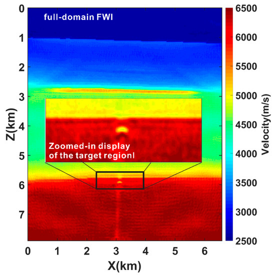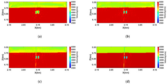 In the standard Marchenko receiver redatuming-based local FWI, a total of 45 surface sources at = (X: 1200–4800 m; Z: 0 m) above the target area are used in the calculation, while the VSP-driven local FWI also contains 35 subsurface sources at = (X: 2500 m; Z: 6300–7000 m). Starting from the target region of the smooth velocity model in Figure 7b, the minimum frequency of the inversion is 8 Hz, the maximum frequency is 44 Hz, and the step size of the frequency is 2 Hz. To sharpen the inversion results, we use the minimum support regularization as a constraint. It should be noted that in this example, the weighting factor is 1 because the number of VSP virtual sources and surface sources in the inversion are similar and the energy is also balanced. The results of the local FWI based on the standard Marchenko redatuming are shown in Figure 10a. The result of the VSP and Surface data jointed local FWI is shown in Figure 10b. For reference, we also replaced the standard Marchenko retrieved signals with the corresponding measurement signals to perform local FWI, and the result is shown in Figure 10c. From Figure 10b, the cavity boundaries are well characterized to match the true model. Compared with Figure 10a, the inverted model in Figure 10b has a better lateral resolution, and the two cavities are clearly separated, while the strike-slip fault with a steep dip angle can be reconstructed. The result of VSP and Surface data jointed local FWI still has certain errors for the characterization of the strike-slip fault compared to Figure 10c, and it is mainly due to the mismatches in the redatumed Green’s function caused by the deep depth of the target area and the limited acquisition aperture.