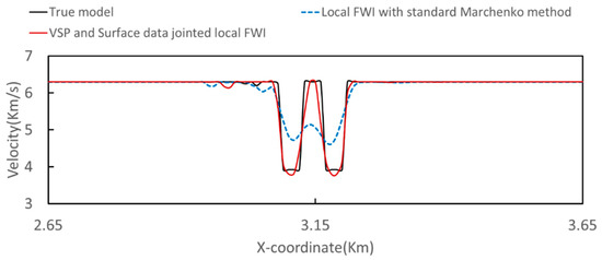 The comparison of the lateral model single trace at a depth of 5.85 km is shown in Figure 11, which can more clearly demonstrate the difference in lateral resolution and accuracy of the inversion results of different methods. Especially in cavity reservoir locations with low impedance, the results of the standard Marchenko method of local full waveform inversion cannot reconstruct accurate parameter values. The inversion result of the VSP and surface data jointed local FWI looks closer to the actual model.