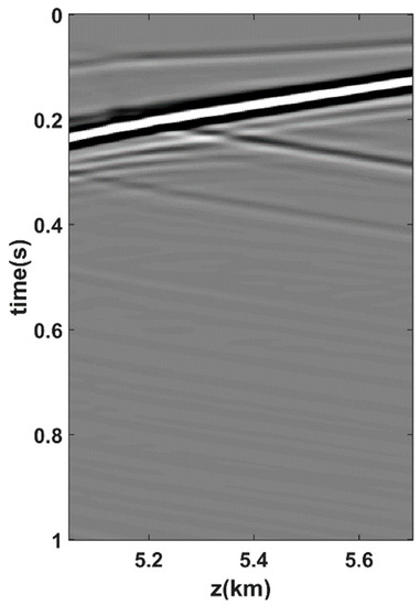 However, there are still issues with the proposed method. This paper presents the Marchenko source-receiver redatuming with the requirement that the virtual receiver is above the virtual source [25]. Both the focusing and Green’s functions can be calculated at every point. The Green’s functions can be calculated between any two points when both input fields are Marchenko estimates [26]. However, the VSP data as actual observations of the receivers in the well lead to the situation that when using the VSP Marchenko source-receiver redatuming method, we can only estimate the Green’s function between a virtual source at a location of the VSP receiver to an arbitrary point above it. This limits the application of the VSP-driven local FWI. At the same time, in the case of vertical structures such as faults, a large aperture is required to ensure that the primary amplitude reflected from the vertical structure can be measured at the surface. In other words, to perform VSP Marchenko source-receiver redatuming to obtain the exact Green’s function containing the laterally propagating waves also requires certain aperture conditions. We reduce the surface shot records used for the Marchenko redatuming in the example chapter to 105 shots (X: −1000 m–7400 m) and recalculate the Green’s function. The common VSP virtual source gather is shown in Figure 14. Compared with Figure 9a, the retrieval accuracy of the laterally propagating waves receives a larger impact with the reduction of the aperture. The main reason for the current limitation of local full waveform inversion mainly depends on the accuracy of the redatumed wavefield, and more exploration in this direction is needed in the future. In addition, considering the viscoelastic behavior of subsurface in petroleum exploration is crucial because viscoelastic inversion is highly sensitive to fluid content due to the energy losses caused by their viscosity [30,31]. This sensitivity is explained by viscous fluid flow during the passage of the waves, which causes frictional movement at the grain surfaces [32,33]. The physical complexity of FWI models can be overcome by incorporating machine-learning models [34]. Therefore, incorporating the viscoelasticity and machine learning models in local FWI may significantly enhance seismic imaging and interpretation in reservoir zones, which is the direction of our future research.