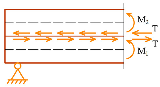 Behaviour of a layered concrete member, where M1 and M2 are the bending moments of each layer and T is the shear force acting at the interface between the layers.