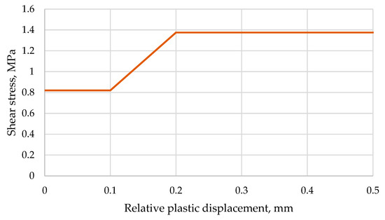 The friction model requires the values of concrete cohesion, friction angle and dilation angle. Cohesion stress was determined according to Eurocode 2 [39]. For a smooth-surface interface, the suggested cohesion coefficient was . The cohesion stress was equal to . The interface friction angle was taken as 30°, which is a recommended value for a smooth interface [40]. The dilation angle, which determines the width of an interface crack in the perpendicular direction, was assumed to be equal to . By choosing this value, it was considered that the surface was smooth enough that layers slipped without significant displacement in the perpendicular direction. Additionally, the interface model was supplemented by a curve, which, in the model, was called “cohesion hardening”. This indicates the magnitude of the concrete layer bonding stress. However, in this case, the first stress value represented a value of cohesion stress, which was already presented, and the second value specified a value of the concrete layer clamping stress, which was caused by tensioned connectors (after the loss of a cohesive bond) (Figure 7). The relative displacement values were chosen to be small enough to be automatically adjusted while performing a non-linear analysis and, at the same time, realistic. Clamping stress was determined according to Eurocode 2 [39]. All the physical parameters for three numerical models are presented in Table 1 and Table 2.