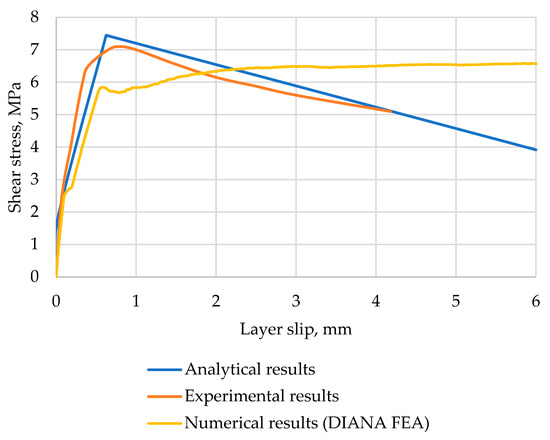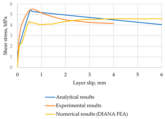 The interface of an experimental specimen (Figure 8) behaved plastically up to the highest shear resistance. This implies that the highest shear resistance was reached with the help of interface friction and connectors, as the interface began to crack early. The experimental analysis curve reached a maximum shear stress value of at a shear slip of . Then, the shear stress slightly decreased and the push-off test was stopped at a shear stress value of , which corresponded to a slip of . The analytical curve displays a different behaviour. However, the highest shear stress values were similar. The highest shear stress for the analytical curve was , which was 1.4% lower than that of the experimental curve. In addition, the corresponding slip was determined to be , which was lower than the experimental slip by 103%. After the highest interface shear capacity, the analytical curve displayed a decrease in shear stress to , which meant that cohesive stress was lost and interface shear resistance consisted only of friction and the connectors’ resistance. From this point, shear stress gradually decreased. By comparing the experimental and analytical curves, their shear stress and slippage values, it can be stated that the proposed analytical method was able to predict a similar shear interface behaviour, especially for the highest interface shear capacity. However, the values at the stage of friction and connectors’ action should be much closer to the experimental values. By analysing this case and by taking into account the results presented in Figure 9 and Figure 10, it can be stated that the proposed analytical model should be improved to predict the cases more accurately when weaker concrete and smaller interface connector ratios are used. The numerical analysis curve was similar to the experimental curve by its shape. Nonetheless, the determined shear stress values were smaller. The loss of cohesion was visible at a shear stress of and slip of . After this point, it was assumed that concrete-to-concrete (cohesion) bonding should be neglected and that the shear resistance of the interface was mainly achieved by the interface’s friction and connectors’ resistance. The numerical analysis curve reached the highest shear value of , which was 56% lower than the experimental value. This shear stress was determined at a slippage of , which was 59% lower than the experimental slip.