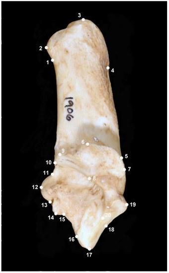 Medial view of a right sheep calcaneum. The image shows a set of 20 landmarks used for the study of the medial aspect of the calcaneum of domestic sheep. Landmark numbers correspond to those listed and described in the text. These landmarks were divided into two different modules to describe the changes in size and shape of structures of first order: one for the body and the process of the calcaneum (4 landmarks) and the other for the distal half of the bone (tuber calcanei) (16 landmarks).