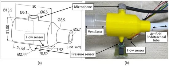 Sensor connector for connecting ventilator and ET tube and acquisition of respiratory signals. (a) 3D drawing, and (b) actual view of the sensor connector to which the sensors are connected.