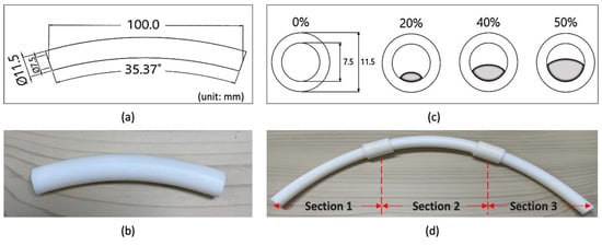 After ET intubation, the location and degree of foreign substances deposited in the ET tube vary depending on the patient’s condition and symptoms []. Therefore, an artificial ET tube was manufactured to acquire changes in the respiratory signal based on the location and degree of obstruction in the tube. The shape of the ET tube was designed using SolidWorks software; the tube had an inner diameter of 7.5 mm, a curvature of 162 R, and a total length of 30 cm, similarly to those used for adult patients. To simulate the various locations and degrees of obstruction, the artificial ET tube was divided into three parts of 10 cm each and printed with Agilus (Shore 95) material using a 3D printer (J850, Stratasys Ltd., Eden Prairie, MN, USA) (Figure 3a,b). The Shore hardness of the printed artificial ET tube measured by type OO using a durometer (GS-754G, TECLOCK, Nagano, Japan) was 95. Therefore, it was not distended or deformed even when the pressure change occurred in the ventilator. The degree of obstruction of each part was 0% when there was no foreign material compared to the cross-Sectional area of the tube, and 20%, 40%, and 50% obstructions were printed on a 30 cm long Section depending on the amount of foreign material (Figure 3c). Three 10 cm long tubes of equal proportions were made, and they were cross-connected to each other to adjust the location and degree of obstruction (Figure 3d). The obstruction locations were named Sections 1, 2, and 3.