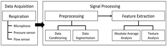 Respiratory signal analysis was performed using the following steps: pre-processing, feature extraction, absolute value average analysis, and texture analysis. Data conditioning and segmentation were conducted during pre-processing. Next, statistical characteristic analysis was employed for feature extraction using texture analysis. All analyses were performed using MATLAB (MathWorks, Inc., Natick, MA, USA). Figure 4 shows a step-by-step block diagram of the analysis of the respiratory signals.