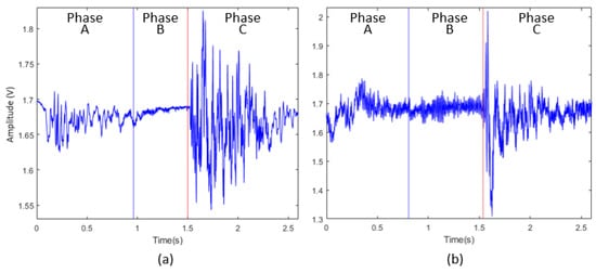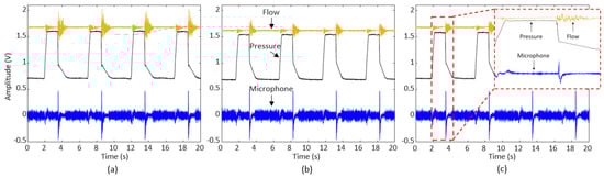 Figure 6 shows the signals acquired from the sensor connector. Figure 6a–c show the signals for 50%, 40%, and 20% obstruction in Sections 1, 2, and 3, respectively. Respiratory sound, pressure, and flow rate were well measured at the same time in all repeated respiratory cycles. The result of extracting one respiratory cycle is highlighted in Figure 6c. All of the respiratory signals were acquired based on the pressure signal. As the pressure signal was used, the separation was clear even in the presence of external noise.