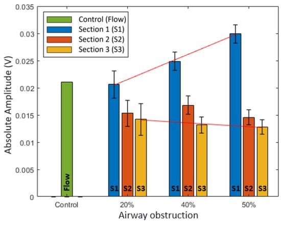 Texture analysis of Phases A, B, and C for flow revealed that only Phase C showed significant results. The texture analysis of average data revealed that the control data for flow showed significant differences except for the 20% obstruction case of Section 2 (p = 0.806) and 40% obstruction case of Section 3 (p = 0.134) (Table 3). Analysis of the degree of obstruction between all Sections and by Section indicated significant differences in all cases (p < 0.05) except for between 40% and 50% obstruction cases of Section 2 (p = 0.337). Both the location and degree of obstruction were significant in the combined microphone and flow sensor signal.