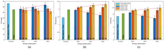 Figure 9 shows the texture analysis results. Figure 9a shows the average results of the texture analysis. The combined microphone and flow rate data showed the largest values compared to all other degrees and locations of obstruction. The averaged flow data results of the texture analysis showed a trend similar to that of the absolute average analysis results. Figure 9b,c show the skewness and kurtosis of the texture analysis, respectively. The combined microphone and flow sensor data showed the smallest value compared with all other degrees and locations of obstruction. The degree of obstruction results for Section 1 showed that the value was lower with a higher degree of obstruction and the value at 20% obstruction was similar to that of the control. In Section 2, no trend was observed. In Section 3, unlike in Section 1, the value increased with an increase in the degree of obstruction. Table 4 shows the linear model results for the degree of obstruction according to the location of obstruction. The location of obstruction results showed that the value increased as the location of obstruction moved away from the mouth, regardless of the degree of obstruction.