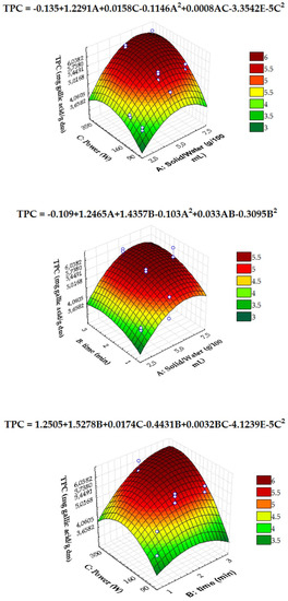 According to the equation, the TPC of the extracts increased mainly with the increase in the linear ‘solid-water ratio’ and ‘power’ terms, and decreased with the increase in the quadratic ‘solid-water ratio’ term. To allow the graphic visualization of the effects of the independent variables on the TPC, the application of RSM gave rise to three surfaces and the related equations that plotted two independent variables at a time, keeping fixed the other factor at the central value of the experimental design (Figure 2).