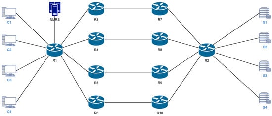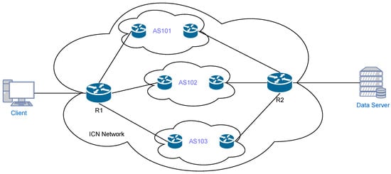 We simulate a simple network consisting of two ICN edge nodes (one for the source and one for the destination), a name resolution system, and multiple multipath service nodes. They are connected by links, where the network metrics can be arbitrarily set according to different simulation requirements. Adjustable network indicators include delay, bandwidth, packet loss rate, etc. The topology we use is a multipath topology, as shown in Figure 4. The topology of Figure 4 represents the infrastructure of the future Internet, and there are multiple completely disjoint paths between Internet service providers (ISPs). To further evaluate the performance of our proposed node selection algorithm, we use the topology shown in Figure 5, which contains three different AS domains. By default, the link capacity of the two topologies is 10 Mbps, and the link delay is 10 ms.Then the corresponding network indicators are changed as needed.