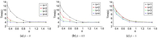 Figure 6 shows the change curve of data transmission completion time with and k. In this experiment, the value of the skewness factor is 0, 0.5, 1. From Figure 6a, we can see that in the range [0.3, 1.5] of , the data transfer completion time decreases as k increases. This shows that using multiple paths for concurrent data transmission can effectively provide bandwidth aggregation. At the same time, we note that the decrease in the data transfer completion time slows down as increases, especially when . This shows that multipath transmission has a good effect in bandwidth-constrained scenarios, but not in bandwidth-unconstrained scenarios. On the other hand, we note that the decrease rate of data transmission completion time decreases with the increase of k, which indicates that a smaller k value (k = 2 or 3) can obtain most of the performance gains of multipath transmission and reduce the overhead of path maintenance.
