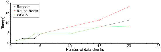 This experiment will analyze three data scheduling strategies from two aspects of data transmission completion time and throughput. It can be seen from Figure 7 that when the path bandwidth difference between sub-paths is large, the random selection strategy and the Round-Robin strategy are not as good as our proposed strategy of allocating data chunks according to path weights. This is because, in the scenario of path bandwidth differences, the completion time of data transmission based on random and Round-Robin strategies is limited to the completion time of data transmission on sub-paths with the lowest path bandwidth. However, our proposed strategy can allocate the number of data chunks according to the weight of the path, which leads to the completion time of data transmission being only related to the overall size of the data and the total bandwidth of the four sub-paths, not limited to a specific sub-path. In addition, we note that as the number of data chunks transmitted increases, our proposed strategy has a shorter transmission completion time. This shows that our proposed strategy can achieve better results in the scenario of big data transmission.