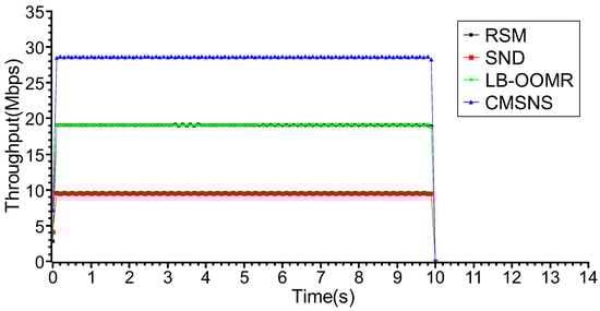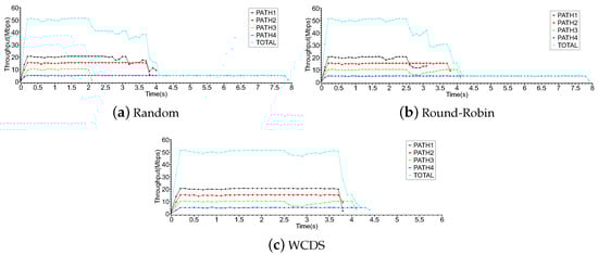Figure 8 shows the throughput difference between the three data scheduling strategies in the scenario of transmitting 10 data chunks, each data chunk size is 2 M. From Figure 8a,b, we note that the throughput at the data receiver decreases over time. This is because in the scenario of path bandwidth difference, the sub-path with higher bandwidth resources takes the lead in completing the data chunk transmission task assigned to the path. However, at the same time, the sub-path with lower bandwidth resources still has more data chunks to transmit, resulting in a decrease in the throughput of the data receiver. As the throughput decreases, the data transmission completion time at the data receiver gradually increases. From Figure 8c, we can see that our proposed strategy can maintain high throughput for a long time. This is because our proposed strategy can allocate the number of data chunks according to the weight of the path, which leads to the completion time of data transmission no longer being limited to the bandwidth resources of a specific path but the total bandwidth resources of all sub-paths.