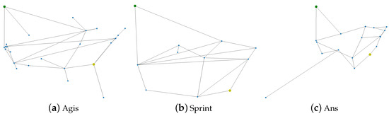 Network Topology of Different ASes. (a) Agis topology. (b) Sprint topology. (c) Ans topology.