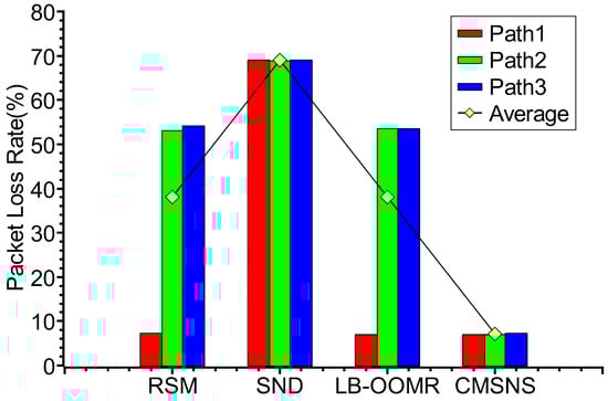 Figure 11 shows the packet loss rates of each sub-path and the average packet loss rates under different node selection algorithms. From Figure 11, we notice that Path2 and Path3 of RSM algorithm, SND algorithm and LB-OOMR algorithm have higher packet loss rates, increasing in the average packet loss rates. This is because the two sub-paths are in the same AS domain, and there are overlapping links between the two paths. On the overlapping link, the two sub-paths compete for the common bandwidth resources, increasing in the packet loss rates on their respective paths. However, our proposed algorithm can guarantee the independence between sub-paths, so there is no case where multiple sub-paths compete for the same link resource. This experiment shows that compared with RSM, SND and LB-OOMR, our proposed algorithm can give full play to the advantages of multipath.