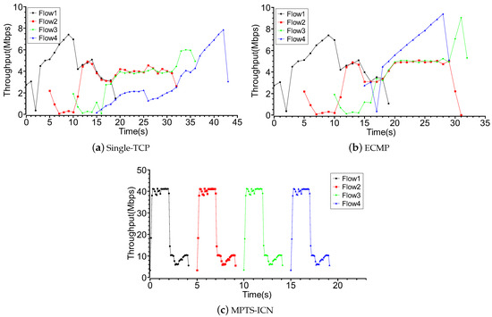 Throughput under different data transmission schemes. (a) The variation trends of the throughput under the Single-TCP scheme. (b) The variation trends of the throughput under the ECMP scheme. (c) The variation trends of the throughput under the MPTS-ICN scheme.