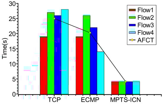 As seen from Table 2, MPTS-ICN has the shortest flow completion time, and Single-TCP has the longest flow completion time. Furthermore, MPTS-ICN outperforms Single-TCP method by 83.6% and the ECMP method by 79.7% in average flow completion time.