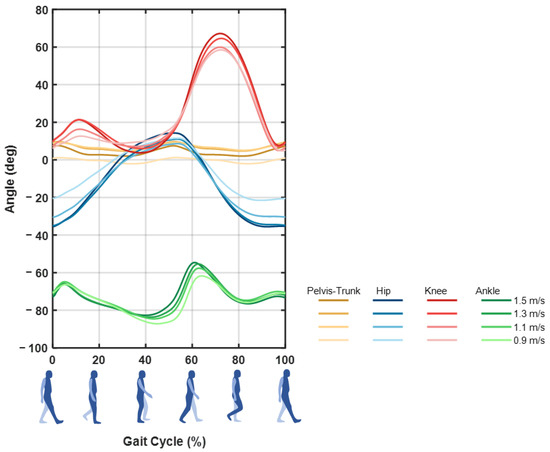 Ankle, knee, hip, and pelvis-trunk joint angles at walking speeds of 0.9, 1.1, 1.3. and 1.5 m/s.