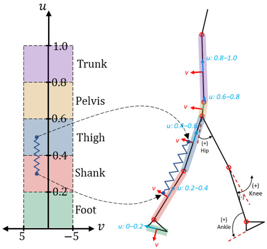 The design parameters of the passive walking assistance system were the stiffness, free length, and location of the spring. The tension spring that was used in the device generated forces depending on the stiffness when the length of the spring exceeded the free length of the spring. The placement of the walking assistance system was determined by using the position of both ends of the spring, (x1, y1) and (x2, y2). The positions (x1, y1) and (x2, y2) were defined on the u–v coordinate system, which was aligned to the distal-proximal direction of the human body. The definition of the position of the spring on the human body is shown in Figure 3. The u-axis describes the location on the distal–proximal direction. The value of u was between 0 and 1. A value of u between 0 and 0.2 described the location on the foot from toe to heel. Similarly, the ranges of 0.2–0.4, 0.4–0.6, 0.6–0.8, and 0.8–1 determined the positions on the shank, thigh, pelvis, and trunk, respectively. The v-axis was perpendicular to the u-axis, and the range of the v-axis was defined as ± 5 cm.