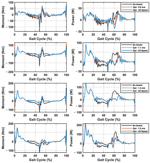 The optimal stiffness and free length of the assistive system were found for each walking speed and single design that considered all walking speeds. Hip joint moments and powers with/without walking assistance systems are shown in Figure 5. The optimal parameters specific to a certain walking speed reduced the joint power more than the optimal parameters that considered all walking speeds.