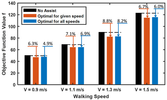 Walking speed affects joint angles and moments. Therefore, it was expected that walking speed would affect the optimal parameters of the walking assistance system. For this purpose, the stiffness and free length of the spring system were optimized at walking speeds of 0.9, 1.1, 1.3, and 1.5 m/s. In addition to the optimal systems designed specific for a certain walking speed, the stiffness and free length were optimized by considering all walking speeds as given in Equation (5). fv is the value of the objective function for the walking speed v.