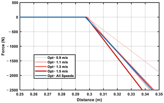 Force–displacement characteristics of speed-specific optimal walking assistance system and walking assistance system that considers different walking speeds.