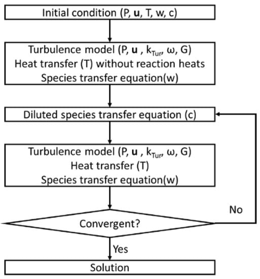 To overcome the convergence issue arising from the combination of complicated equations, iterative and auxiliary calculations are applied in this model. Figure 2 shows the iteration calculation of the computing sequences, where the turbulence model; heat transfer without reaction heats; and species transfer equations of N2, O2, and N2O are calculated first, and then the diluted species transfer equation and heat source are applied. In addition, auxiliary calculations are used in the diluted species transfer equation, where the reaction rates are multiplied by 0.001, 0.01, 0.1, and 1 to reach the real reaction rates. Consequently, the heat and species do not change dramatically, and the model remains stable. After several iterations, the solution convergence is evaluated.