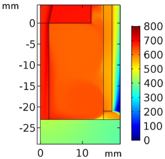 The simulated and experimental temperature measurement results were plotted using MATLAB R2022b, as shown in Figure 5. In the experiment, the temperature below the exit (r = 0 mm) was 643 °C in air and 500 °C on the surface, and these temperatures respectively decreased to 538 °C and 417 °C at a radius of 9 mm. However, the simulated temperature profiles were slightly lower than the experimental result below the exit and were slightly overestimated on the surface at a radius of 9 mm. This might be because of the error arising from model domain simplification. For instance, we ignored the heat capacities of some materials and assumed the downstream surface material (FGWV in Figure 1) to be limited to an only 300 mm radius plate even though the radius is approximately 100 cm in reality.
