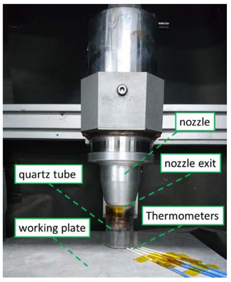 To validate the simulated results, an experiment was performed with a nitrogen DC pulse APPJ with a quartz tube design [6,7] and the same dimensions and inlet gas setting (N2 with 10−3 O2) as those in the computing model, and the temperature was measured at the plasma equipment. In Figure 4, the inlet gas was supplied from the top of the nozzle exit and excited by electron and heat inside the nozzle. Then, the plasma flowed from the nozzle to the working plate inside the quartz tube, passed through the gap under the quartz tube, and finally mixed with outside air.