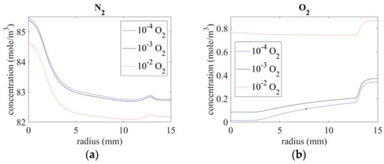 Figure 6 shows the nitrogen and oxygen distribution on the surface at different radii with the given inlet gas impurities. Below the exit (r = 0 mm), the nitrogen concentration was around 85 mole/m3, and the oxygen concentrations with inlet gas conditions of 10−4 O2, 10−3 O2, and 10−2 O2 were 0.013 mole/m3, 0.085 mole/m3, and 0.76 mole/m3, respectively. At a distance from the center, the oxygen concentration increased because of the air intruding from the bottom of the quartz tube; at the same time, the nitrogen concentration decreased because nitrogen was oxidized to nitrogen oxide (NOx).