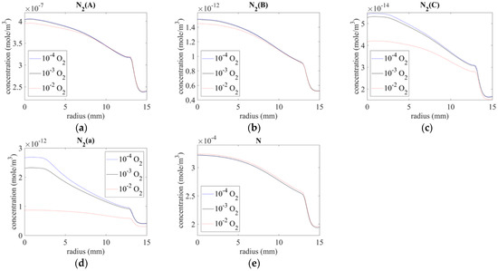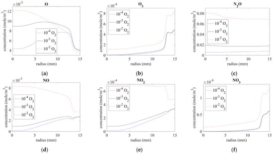 Atomic O is a highly active chemical, and it rapidly reaches a stable concentration at atmospheric pressure in combination with intruding surrounding air, as illustrated in Figure 8a. N-series excited components and N2 react with oxygen from the gap under the quartz tube in the downstream and produce O3, NO, NO2, and NO3. Therefore, O3 and NO3 increased by almost ten times below the exit, as shown in Figure 8b,f, respectively, and the same could be seen for NO and NO2 with impurities of 10−4 O2 and 10−3 O2, as shown in Figure 8d,e, respectively. An impurity of 10−2 O2 seemed to cause saturation for NO and NO2 such that the concentration decreased along the radius. By contrast, N2O was relatively stable and exhibited little variation when mixed with downstream air, as shown in Figure 8c.