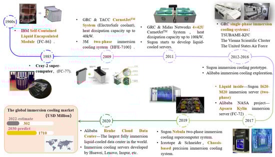 The development of liquid immersion cooling technology for electronic devices has roughly experienced the exploration period (before 1992), the research period (1992–2016) and the small-scale application period (2016–present) [,,,,,,,,,,,,,,,,,,,,,,], shown in Figure 1. According to MarketsandMarkets, the market is expected to grow from USD 244 million in 2021 to USD 1710 million by 2030, at a GACR of 24.2% from 2022 to 2030 []. Many companies such as Huawei, Lenovo, Inspur, Facebook, Microsoft, etc., have also developed immersion liquid-cooled high-density servers. Before liquid immersion cooling technology steps forward to overall large-scale deployments, there are lots of key technologies to be resolved, for example, product development, the formulation of unified standards, the screening of liquid coolants, etc. [].