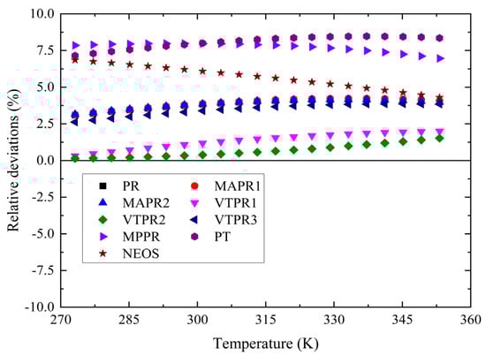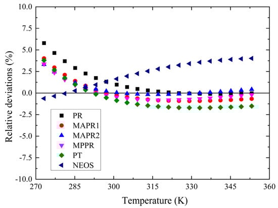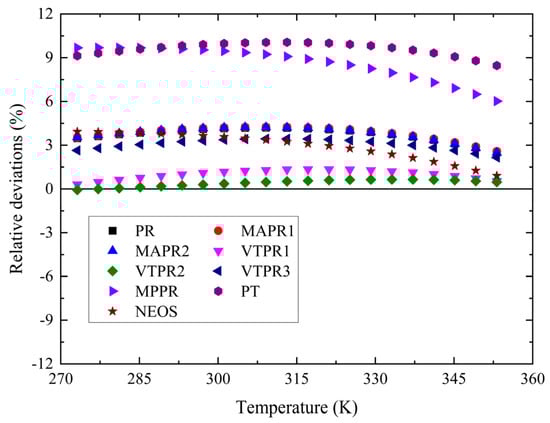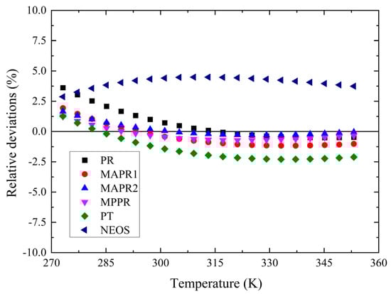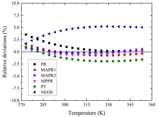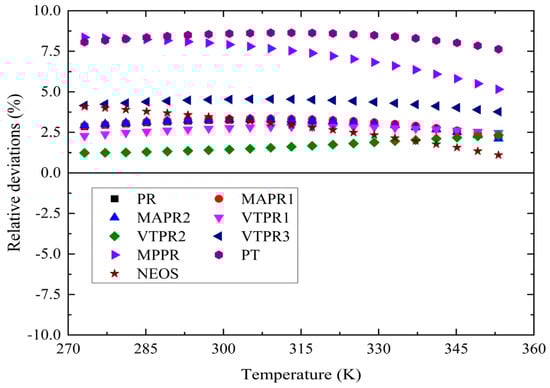 From Figure 5, Figure 6 and Figure 7, it can be known that compared with the PR model, the modification of the α function (MAPR1 model and MAPR2 model) cannot significantly improve the predictive accuracy of saturated liquid densities, which is exactly as some have scholars proposed, that the modification of the α function was more beneficial for predicting saturated vapor pressure, but for liquid density, this modification did not seem to work [,,,]. The specific volume translation modification method of the PR equation has a direct impact on the prediction of liquid densities. Except for the VTPR3 model, the VTPR1 and VTPR2 models have higher predictive accuracy than the PR model, and the VTPR1 model has the highest accuracy. In most cases, the PT model has a poor accuracy when saturated liquid densities are predicted. Furthermore, for some models, a good predictability of saturated vapor pressures does not mean a good predictability of saturated liquid densities. For instance, the MPPR model has a high accuracy ranking only second to the MAPR2 model for saturated vapor pressures, while its accuracy is really low for saturated liquid densities. These results were also summarized by Haghtalab et al., who showed a low accuracy of the PT model [] and the MPPR model [] when liquid densities were predicted, especially for some fluorinated compounds, such as [−(CF2)4-]. The predictive accuracy of the NEOS model was better than that of the PR equation for FC-72 and Novec 649 for the saturated liquid densities, but its relative deviations between the predicted and reference values were the largest of all the models in most cases when saturated vapor pressures were predicted. Therefore, in consideration of versatility, the MPPR and NEOS models are not recommended.