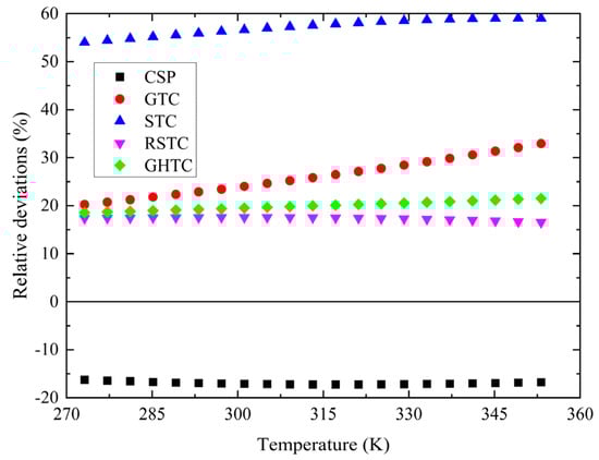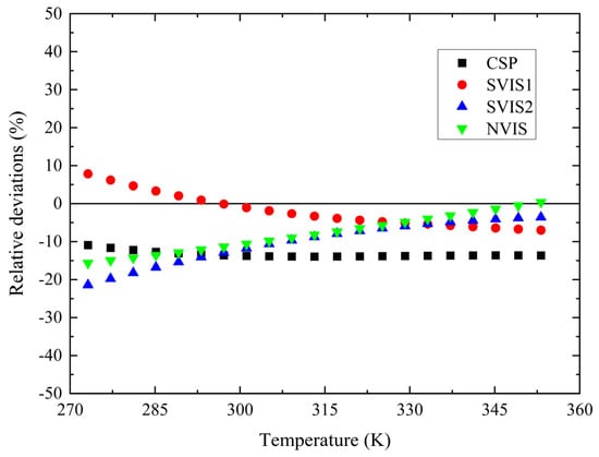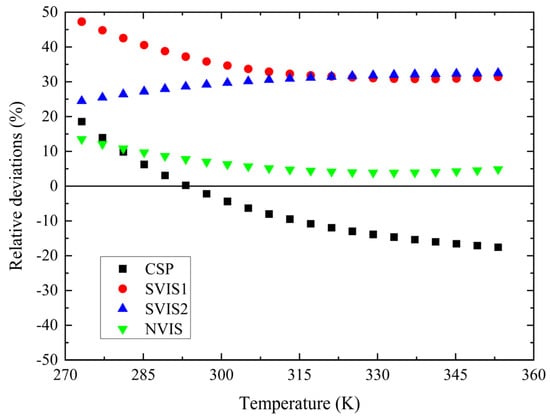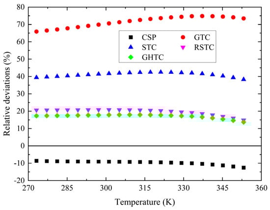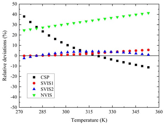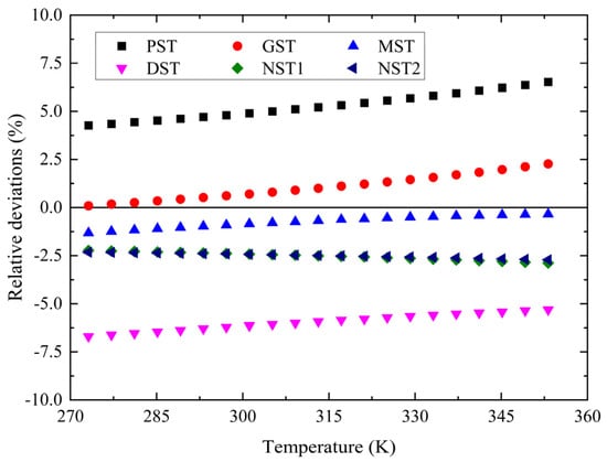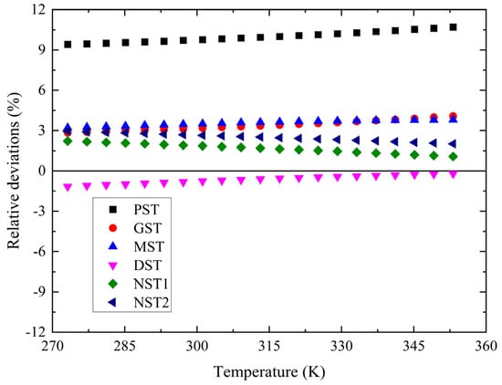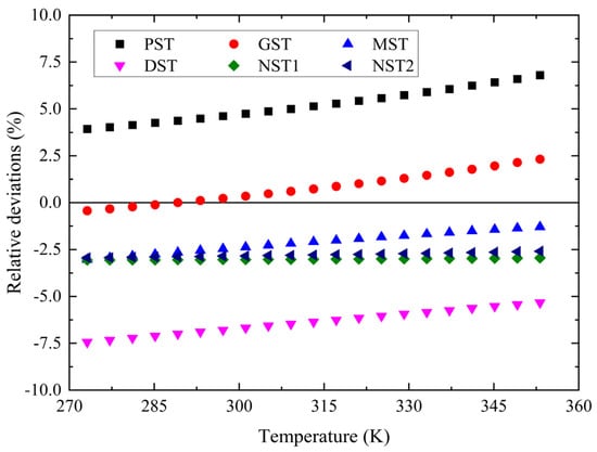 As shown in Equations (15) and (16), since the specific volume translation modification method has little effect on the calculation of saturated vapor pressure, only six prediction models excluding the VTPR1, VTPR2 and VTPR3 models were used to calculate saturated vapor pressure within the temperature range of 273.15 K to 353.15 K at an interval of 4 K (the following work was conducted under the same condition). The relative deviations of the predicted saturated vapor pressures of FC-72, Novec 649 and HFE-7100 obtained by different models are shown in Figure 2, Figure 3 and Figure 4, respectively. The experimental data of the saturated vapor pressures for FC-72, Novec 649 and HFE-7100 were taken from the literature [,,], and the combined uncertainties in measurements (level of confidence = 0.95, coverage factor = 2) of Novec 649 and HFE-7100 were 1.21% [] and 0.82% [], respectively; the uncertainty in measurements of FC-72 was not mentioned in the literature []. The maximum relative deviation (MRD) and ARD between the predicted and reference values of the saturated vapor pressures for the above three liquids are shown in Table 5.