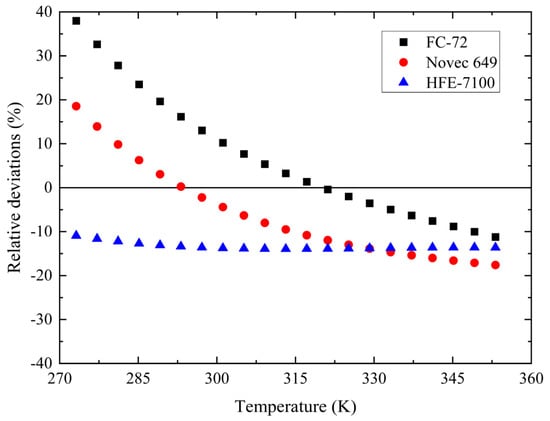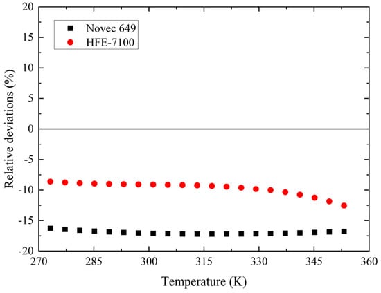 Relative deviations between the predicted and reference values [] of the saturated vapor pressures of Novec 649.
