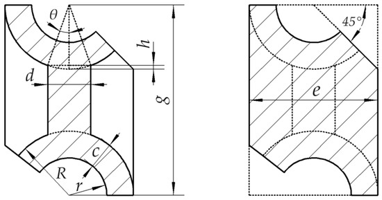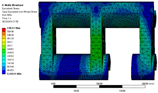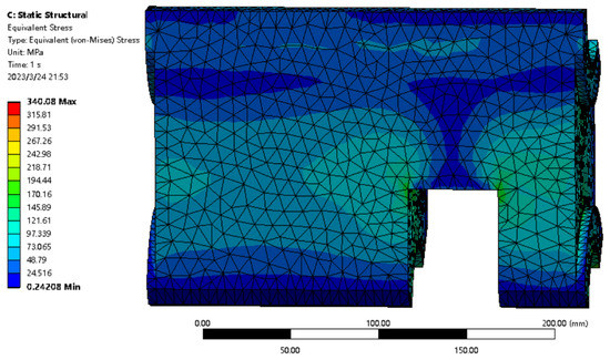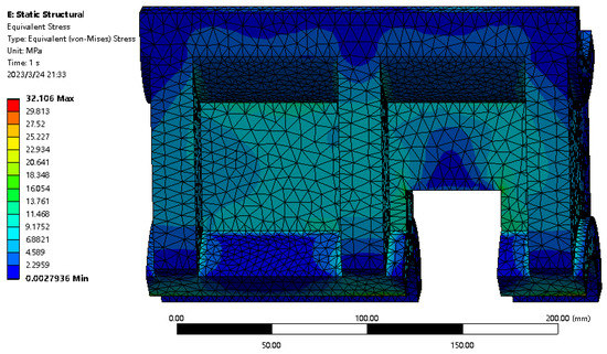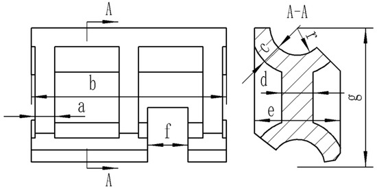 The lightweight drive rod is designed for the 1060 mm 760 mm die-cutting sheet, so it is limited by the transmission distance and mating components, and the two design parameters “g” and “r” are fixed values. Then, based on the range of the above design parameters, the specific values of each parameter are determined according to the mechanical design principles. First, determine the total width of the drive rod “b”. Considering the reserved space for the operation of the drive rod and referring to the data of the traditional double-elbow bar, it is determined that b = 250 mm. Second, determine the thickness of the side reinforcement “a”. There are three reinforcing ribs evenly distributed on the left and right sides of the lightweight drive rod. Based on the design principle of the reinforcing ribs and referring to the data of the traditional hollow double-elbow bar, it is determined that a = 25 mm. Third, determine the thickness of the rotating surface “c”. According to the force magnitude of the drive rod, combined with the relationship between the force and strain of the material, and on the premise of ensuring the rigidity and strength requirements, it is determined that c = 25 mm. Fourth, determine the thickness “d” of the main support wall. The main support surface is mainly used to ensure the stability of the spatial structure during the movement of the drive rod, and its determined value is d = 40 mm. Fifth, determine the total width “e” of the stiffener. During operation, the stiffener mainly carries the torque of the drive rod. The greater the “e”, the stronger the resistance to torque. Considering the reserved operating space, it is determined that e = 110 mm. Finally, determine the reserved slot width “f” of the drive rod. Without affecting the smoothness of operation, the smaller the value of “f”, the better; so, it is determined that f = 51 mm. Summarize the final values of each design parameter based on the above parameter analysis (see Table 2).