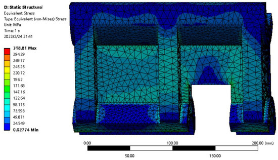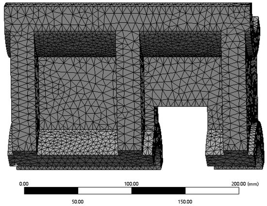 Based on the above optimization results, the drive rod is remodeled according to the optimized parameters (Figure 28), and then finite element analysis is performed on it. Firstly, the material properties of QT900-2 are assigned to the remodeled lightweight drive rod, and the model is meshed. After multiple verifications, accurate data can be obtained by controlling the mesh size to 4 mm (Figure 29). Finally, apply the die-cutting and inertia forces described in chapter 4.3 to the drive rod. After calculation, the strain and deformation of the optimized drive rod can be obtained (Figure 30 and Figure 31).