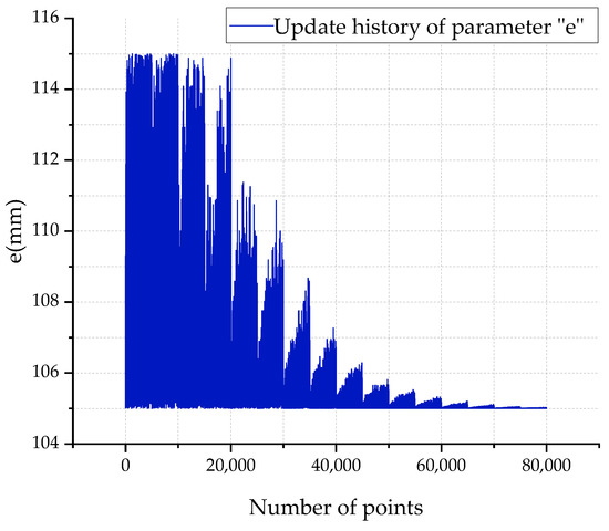 Here, take , , , , . The position change information of the drive rod can be calculated by substituting the rod length parameter into Formula (2) (see Figure 3):