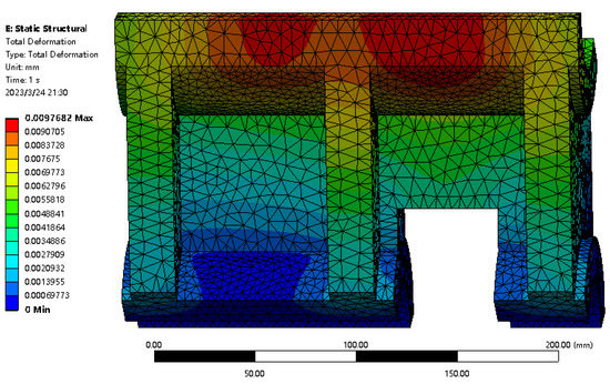 According to the analysis results of the assembly, the deformation of each part of the optimized drive rod remains between 0.007 mm and 0.01 mm in the assembly. The verification results show that the optimization results are consistent with the simulation results. Therefore, the optimization design of the lightweight drive rod in this study meets the target requirements and provides an optimized structure for the optimization and upgrading of the die-cutting device.