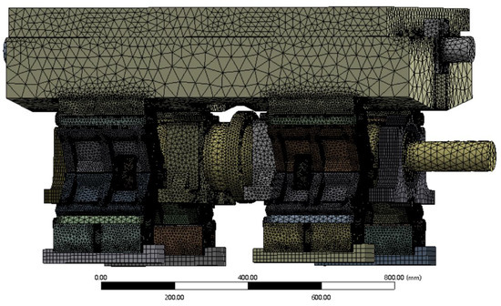 The optimized lightweight drive rod is matched in the assembly, assigning corresponding material properties to each part (Figure 32). The geometric structure is used to control the mesh quality, with a maximum mesh size of 50 mm and a minimum mesh size of 0.25 mm. Finally, 5,216,552 elements and 7,884,026 nodes are generated.