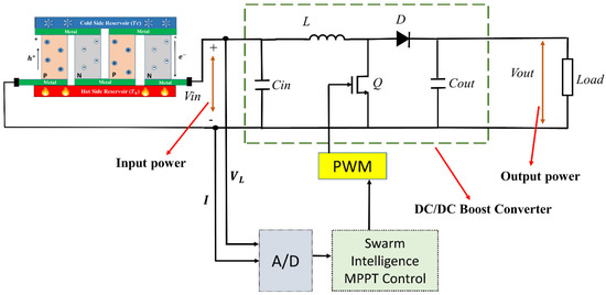 By altering the terminal voltages, the maximum power point of a multi-modular TEG power source with a centralized MPPT control scheme is monitored. At MPP, the terminal voltage is changed so that the power may be delivered to the load more effectively using a DC–DC converter (boost). To change the output voltages and achieve MPP, the duty cycle of the boost converter can be changed. This modification of the control action is carried out by an intelligent controller built on the MRA. The duty cycle is between 0 and 1.