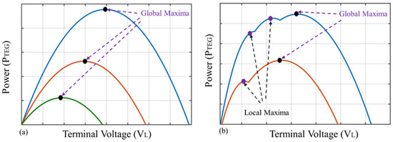 The classical MPPT techniques that have been developed for TEG systems include perturb and observe (P&O), incremental conductance (IC) in fusion with fuzzy logic control (FLC), machine learning (ML) models, and deep neural networks (DNN). Unlike PV and wind energy conversion systems, these techniques are less explored in TEG systems. The P&O technique is a simple and widely used MPPT technique that adjusts the TEG’s operating voltage in fixed magnitude in forward or reverse depending upon the change in output power. Since the decisions are made due to the gradient ascend or descend in the presence multiple local peak solution (shown in Figure 4), the MPPT control, hence, may trap in local maxima, thus losing significant available power. The IC technique is similar to the P&O technique, but it uses a conductance parameter, which is a more sophisticated control algorithm to adjust the TEG’s operating voltage.
