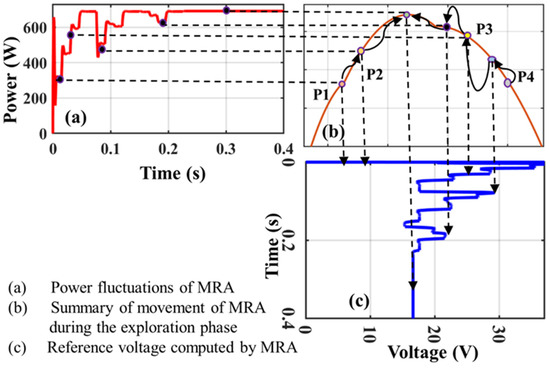 Figure 5 shows the locations of the seeking particle in the search area using a tracking model for MRO. The duty cycle serves as the search space, and its range is from 0 to 1. Computing and contrasting each particle’s voltages avoids the need to repeatedly explore the search space. Four particles, P m r 1 , P m r 2 , P m r 3 , and P m r 4 , are initialized. The searching range of the voltage ( m i n , m a x ) by particle P a i ( i = 1 , 2 , N ) is stored in the variable V P a i . Equation (12) explains the selection of the best particle in terms of the voltage sample values of each particle: