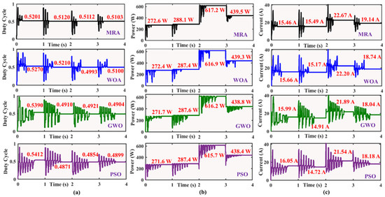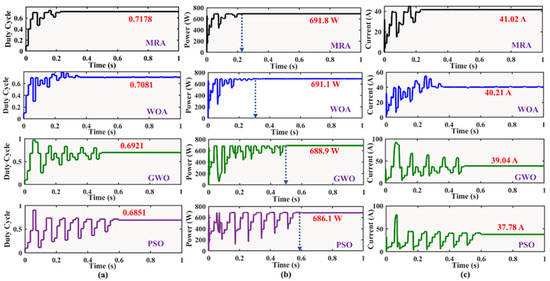 Due to temperature variations, every meta-heuristic approach exhibits re-initialization, exploratory, and exploitative behavior after every two seconds Figure 10a. The MRA monitors the GM more quickly than the previous MPPT approaches and exhibits extremely low oscillations. The MRA, WOA, GWO, and PSO monitor the average power at 404.35 W, 404.0 W, 403.45 W, and 403.35 W, respectively. This demonstrates that the MRA tracks the biggest power loss due to significant oscillations at the GM. In this instance, the tracking efficiency is 99.96%, 99.87%, 99.74%, and 99.71%, respectively.