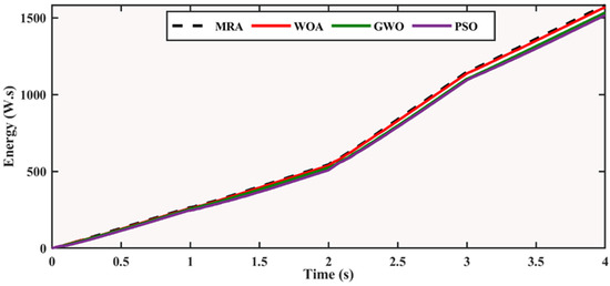 The large oscillations in the developed PSO may be seen in Figure 7. While these oscillations are also present in GWO because of the random probability selection function, which is used to avoid the LM traps, these periodically increasing oscillations are also present. The monitored powers by the MRA, WOA, GWO, and PSO are shown in Table 1 to be 691.8 W, 691.1 W, 688.9 W, and 686.1 W, respectively, with efficiency values of 99.97%, 99.86%, 99.55%, and 99.14%. Figure 7 confirms that the MRA tracks and settles at the GM in 220.2 ms, which is 80 ms–360 ms quicker than the WOA, GWO, and PSO. Figure 7b shows a comparison of the voltage transients. Energy extraction is another crucial criterion for comparison, and Table 2 and Figure 8 demonstrate that, when compared to other MPPT systems, MRA MPPT outclasses them in energy extraction.
