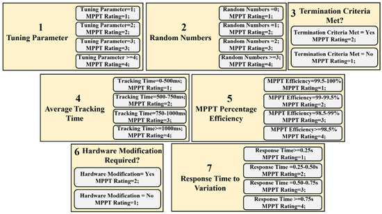 The MPPT rating is computed in this section using Equation (13). The variables for the ratings are: tuning parameter quantity (1–5), random numbers in algorithm (1–5), i t e r max for the GM location (1–5), tracking time (s), the efficiency (%age), the amount of hardware modification necessary for implementation, and the responsiveness of change in irradiance. The criteria for the selection of the ratings are shown in Figure 12. The criteria of the given values against every variable are shown in Equation (13).