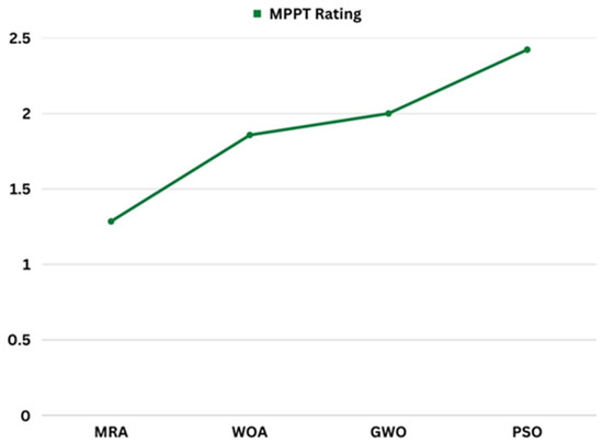 According to Table 3, the MRA does have the greatest MPPT rating of 1.285, indicating that it can follow the GM significantly more quickly. MPPT implementation for the MRA is straightforward because only one tuning parameter is needed. Because the MRA uses only one random number, the oscillations are also reduced. A graphical representation of the MPPT rating achieved by the competing techniques is shown in Figure 13.