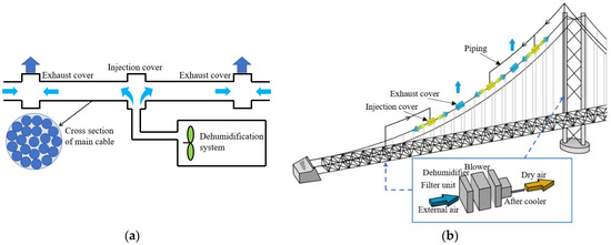 The principle of main cable dehumidification. Reprinted/adapted with permission from Ref. [12]. 2021, Elsevier. (a) The flow of air inside the main cable. (b) Layout of the cable dehumidification system.
